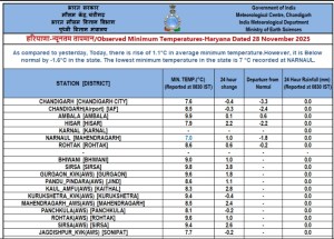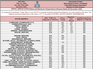 प्रदेश में बीती रात काफी ठंड रही है। प्रदेश में एक भी शहर ऐसा नहीं है जहां का रात का तापमान 10 डिग्री से ज्यादा दर्ज किया गया। नारनौल सबसे ठंडा रहा है। यहां तापमान 7 डिग्री दर्ज किया गया। अंबाला में रात का तापमान सबसे ज्यादा दर्ज किया गया है यहां तापमान 9.9 रहा है। हरियाणा के दिन के तापमान में भी काफी गिरावट दर्ज की जा रही है। दिन के समय यमुनानगर सबसे ठंडा रहा है। यहां का तापमान 23 डिग्री दर्ज किया गया। पलवल 27.7 डिग्री तापमान के साथ प्रदेश में सबसे गर्म इलाका बना हुआ था। हरियाणा के महेंद्रगढ़, रोहतक, गुरुग्राम, मेवात और सिरसा में अधिकतम तापमान 25 डिग्री से कम दर्ज किया गया।