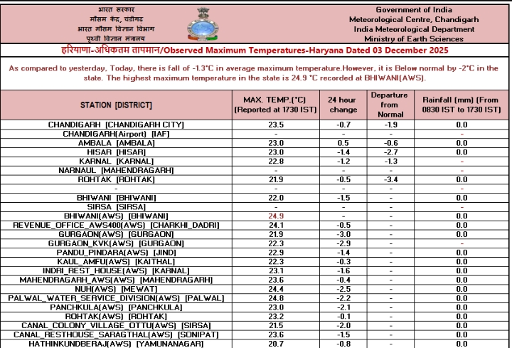 Haryana Weather Update : हरियाणा में AQI लगभग कल के स्तर पर है। हरियाणा में पारा तेजी से नीचे गिरा है। रात का तापमान राज्य के कुछ इलाकों में 3.5 डिग्री सेल्सियस दर्ज किया गया है।