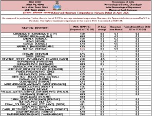 हरियाणा के प्रमुख शहरों में गर्मी का सितम इस कदर है कि 13 से अधिक केंद्रों पर तापमान 42 डिग्री के पार दर्ज किया गया है। इसमें रोहतक 44.6, फरीदाबाद 43.6, नारनौल 43.5, सिरसा 43.4, हिसार 43.0, करनाल 42.8, नूंह 42.7, भिवानी और जींद 42.5, सोनीपत और गुरुग्राम में 42.2 डिग्री दर्ज किया गया। अंबाला में 41.9, झज्जर में 41.5, चरखी दादरी और पलवल में 41.0, पानीपत और रेवाड़ी में 40.9 डिग्री सेल्सियस दर्ज किया गया। हरियाणा में सबसे कम अधिकतम तापमान यमुनानगर में 39.6 डिग्री सेल्सियस दर्ज हुआ। हरियाणा में अधिकतम तापमान सामान्य से औसतन 5 डिग्री ऊपर चल रहा है। रोहतक में यह 5.9, करनाल में 5.6 अंबाला में 5.2 डिग्री सेल्सियस ज्यादा दर्ज किया गया है।