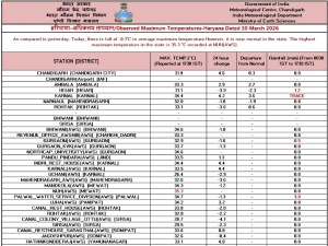 प्रदेश में कल अधिकतम तापमान में पहले दिन के मुकाबले 0.1 डिग्री सेल्सियस की गिरावट देखी गई है। प्रदेश के नूंह में अधिकतम तापमान 35.3 डिग्री सेल्सियस दर्द किया गया जो प्रदेश में सबसे ज्यादा था। करनाल जिले के उचानी में अधिकतम तापमान 26.4 डिग्री सेल्सियस दर्ज किया गया जो प्रदेश में सबसे कम था। इस दौरान सिरसा जिले के ओटू में अधिकतम तापमान 28.7 डिग्री सेल्सियस दर्ज किया गया है। प्रदेश के बाकी सभी जगह तापमान 30 डिग्री सेल्सियस से ज्यादा दर्ज किया गया। प्रदेश के अंबाला अधिकतम तापमान 33.3, हिसार में 31.1, करनाल में 34.4, नारनौल में 32, रोहतक में 33.1, भिवानी में 34.6, गुरुग्राम में 33.7, चरखी दादरी में 33.3, जींद में 33.5, पलवल में 34.7, सोनीपत में 33.6 डिग्री सेल्सियस दर्ज किया गया।