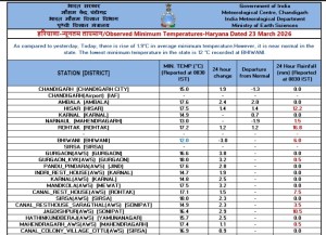 Haryana Weather Update : प्रदेश में मौसम लगातार परिवर्तनशील बना हुआ है। हरियाणा में आज मौसम आमतौर पर शुष्क रहेगा। मौसम विभाग ने हरियाणा के 15 जिलों में कल कहीं-कहीं बारिश की संभावना व्यक्त की है जबकि 26 मार्च को प्रदेश के 9 जिलों के लिए येलो अलर्ट जारी किया है। प्रदेश में अधिकतम तापमान में पहले दिन के मुकाबले 0.4 डिग्री सेल्सियस की वृद्धि दर्ज की गई है लेकिन इसके बावजूद यह सामान्य से दो डिग्री कम बना हुआ है जबकि न्यूनतम तापमान में 1.9 डिग्री सेल्सियस की वृद्धि दर्ज हुई है और यह सामान्य के आसपास बना हुआ है।