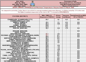 प्रदेश के अधिकतम तापमान में कल पहले दिन के मुकाबले 0.4 डिग्री सेल्सियस की वृद्धि दर्ज की गई लेकिन इसके बावजूद प्रदेश का अधिकतम तापमान सामान्य से 2 डिग्री कम बना हुआ है। प्रदेश के भिवानी और चरखी दादरी में अधिकतम तापमान 30.7 डिग्री सेल्सियस दर्ज किया गया जो प्रदेश में सबसे ज्यादा था। प्रदेश के नारनौल में अधिकतम तापमान 27.4 डिग्री सेल्सियस दर्ज किया गया जो प्रदेश में सबसे कम था। प्रदेश के अंबाला में अधिकतम तापमान 29.1, हिसार में 29.3 और करनाल में 29 डिग्री दर्ज किया गया। रोहतक में अधिकतम तापमान 28.1 डिग्री सेल्सियस दर्ज हुआ। गुरुग्राम में अधिकतम तापमान 30.2 और जींद में 29.4 डिग्री सेल्सियस दर्ज किया गया। नूंह में अधिकतम तापमान 29.3, पलवल में 28.9, पानीपत में 28.2, सिरसा में 29.5, सोनीपत में 29.1 और यमुनानगर में 28 डिग्री सेल्सियस दर्ज किया गया। आज हरियाणा में आमतौर पर मौसम साफ रहने की उम्मीद है। इस दौरान तापमान में मामूली वृद्धि हो सकती है।